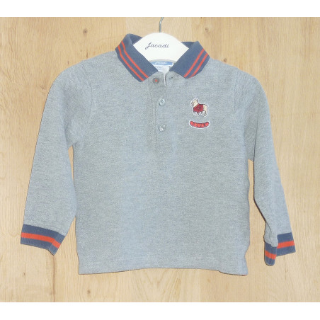 Polo en excellent état de marque JACADI, en coton gris, en maille piquée, orné d'un petit col marine et corail et d'une broderie.
