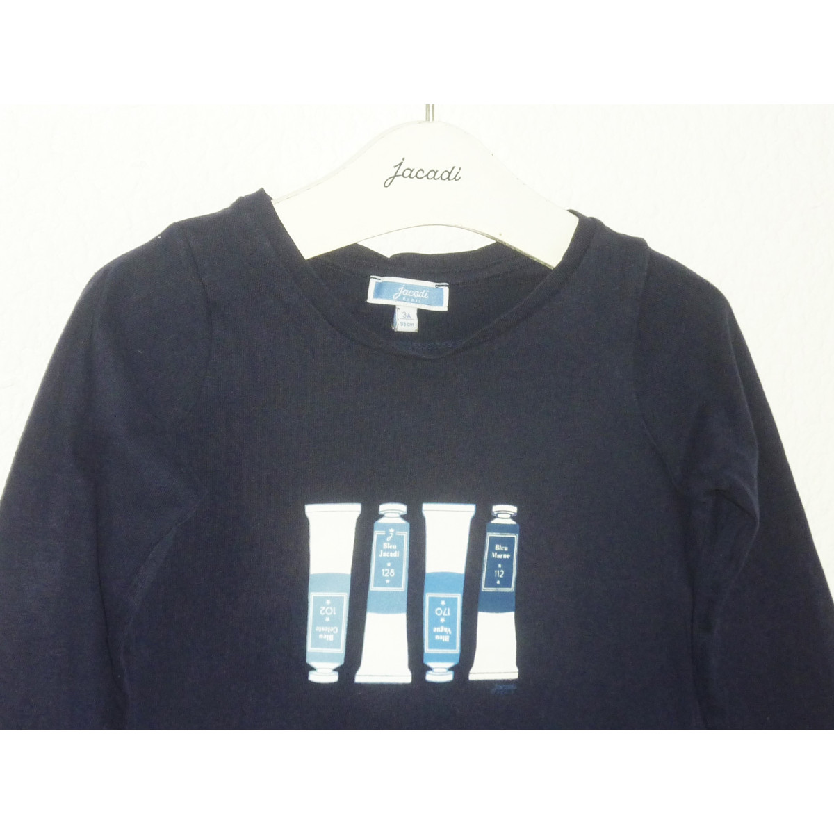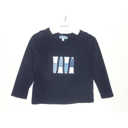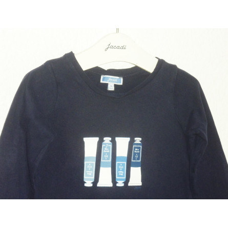 Ensemble de marque JACADI en excellent état. Il est composé d'un pantalon vichy gris fumé avec ceinture ajustable associé au haut bleu encre orné d'une animation devant. Un classique chic de la marque JACADI.