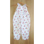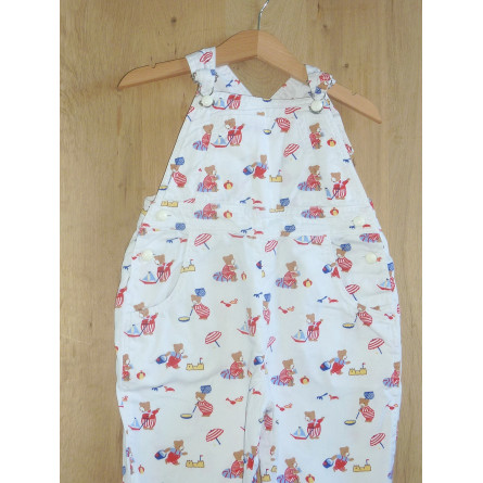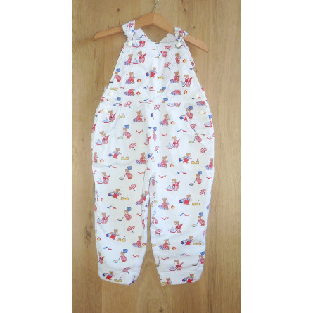 Salopette vintage en excellent état, en denim blanc, imprimé enfantin bleu et rouge.