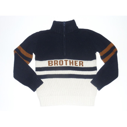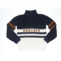 Pull en coton tricoté, de marque TAO, en excellent état, couleur marine et crème, orné d'une inscription couleur moutarde.