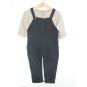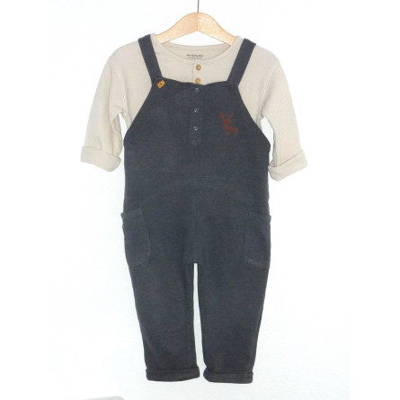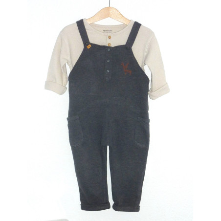 Ensemble de marque VERT BAUDET en excellent état, composé d'une salopette doublée couleur gris fumé, associée au haut beige en coton nid d'abeille.