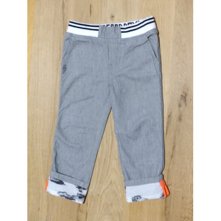 Pantalon de marque CATIMINI en excellent état. Rayures de couleur grise, orné d'un revers imprimé, ceinture élastique.