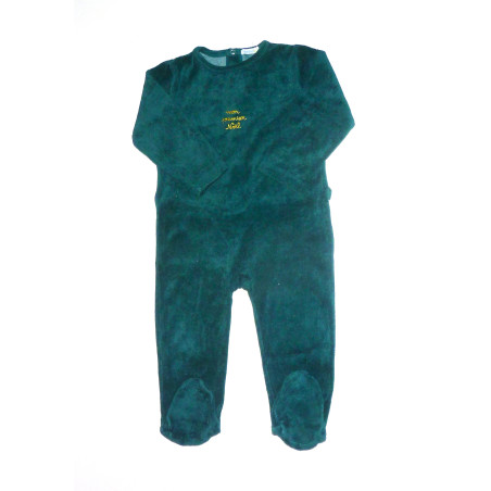 Pyjama en velours bio de marque BOUTCHOU en très bon état, couleur vert sapin, orné d'une inscription dorée.