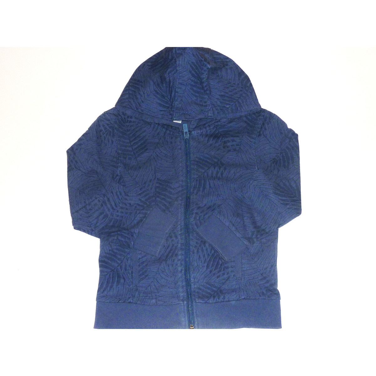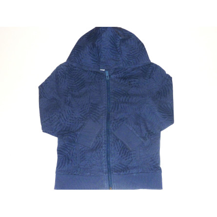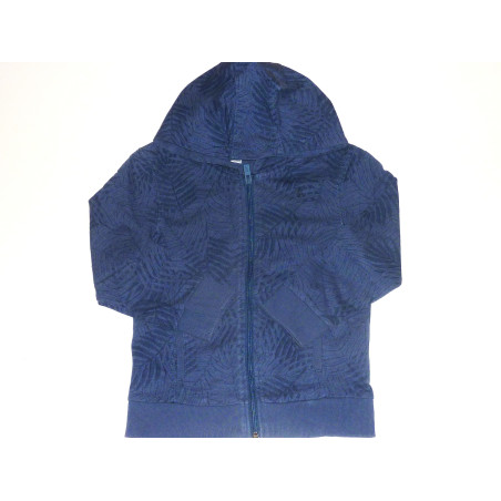 Sweat de marque OKAIDI en excellent état, à capuche, fermeture zippée, bleu imprimé.