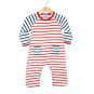 Salopette en coton de marque PETIT BATEAU en excellent état, à rayures de couleur marine et rouge sur fond crème. Ouverture par pressions à l'entrejambe.