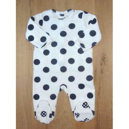 Pyjama en velours tout doux en état neuf (a encore l'attache de l'étiquette), de marque VERT BAUDET, imprimé à pois marine sur fond blanc.