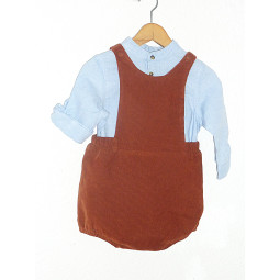 Ensemble de marque KIABI en excellent état, composé d'une barboteuse couleur cognac, en velours finement côtelé associée à la chemise bleue pastel.